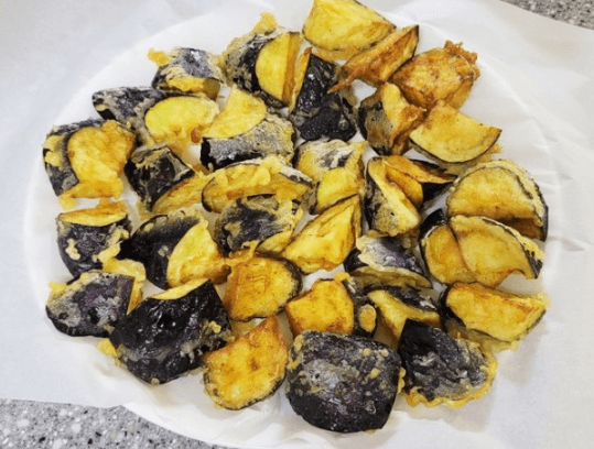 튀김옷을 만들었다면, 가지를 튀길 준비를 합니다. 먼저 가지를 튀김옷에 골고루 말려줍니다. 가지가 튀김옷에 잘 묻어야 고르게 튀길 수 있습니다. 그리고 가지를 기름에 넣어줍니다. 기름은 170-180도 정도의 뜨거운 상태여야 가지가 바삭하게 튀겨집니다. 가지를 넣은 후에는 저어가며 골고루 튀겨주어야 합니다. 가지가 골드색으로 튀겨지면 건져내어 기름을 제거해줍니다.