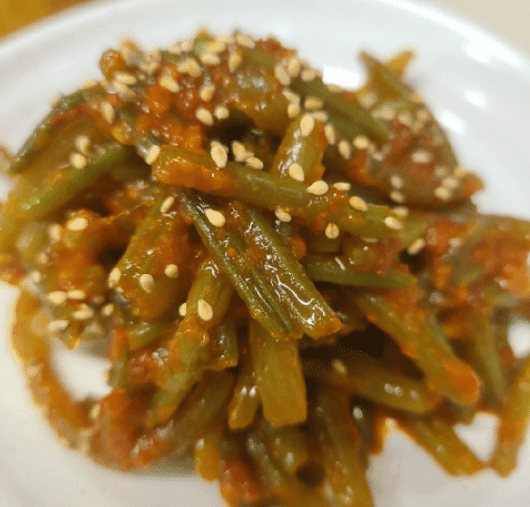 - 데친 고구마줄기를 고춧가루, 다진 마늘, 다진 생강, 간장, 설탕 등으로 간장 양념을 만들어 버무린다.