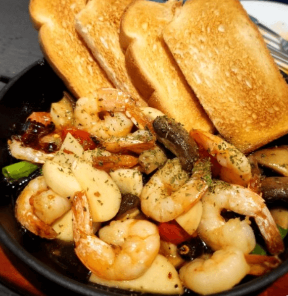 - 감바스를 플레이팅하고 구운 마늘 식빵을 곁들여 서빙합니다.