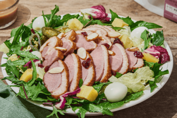- 샐러드 조립: 그린 샐러드 위에 훈제 오리 슬라이스와 과일을 골고루 배치합니다.