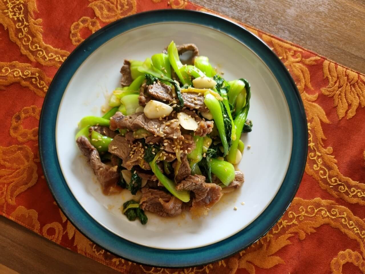 - 청경채 소고기 볶음을 완성하고 밥과 함께 내놓습니다.