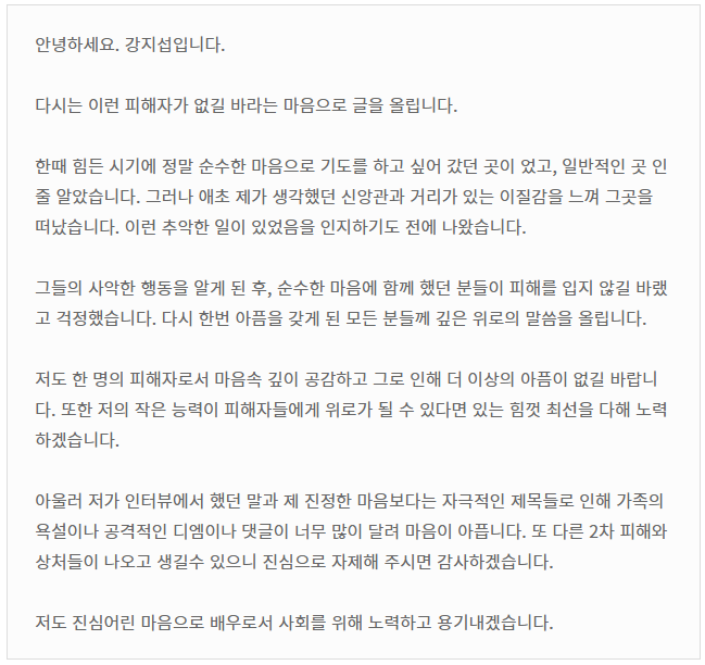 해당 의혹 이후 배우 강지섭 이 JMS (기독교복음선교회) 신도라는