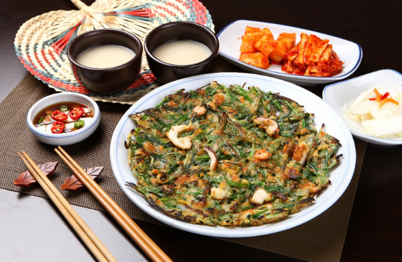해물, 파, 밀가루로 만든 고소한 한국 팬케이크인 해물파전은 종종 간장 소스와 함께 제공된다.