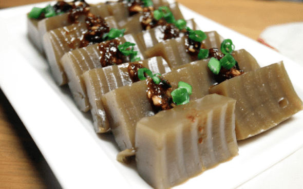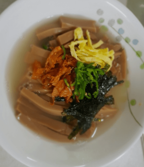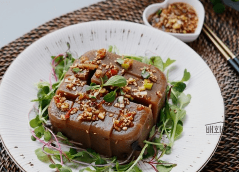 도토리묵은 도토리의 전분으로 만든 한국의 전통 음식입니다. 그것은 젤라틴 같은 질감을 가지고 있으며 다른 많은 디저트에 비해 칼로리가 적습니다.
