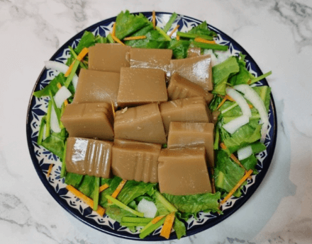 도토리묵이라고도 알려진 도토리묵은 도토리의 전분으로 만든 한국의 전통 음식입니다. 한식의 대중적인 식재료로 샐러드, 찌개, 국수 등 다양한 요리에 사용됩니다.